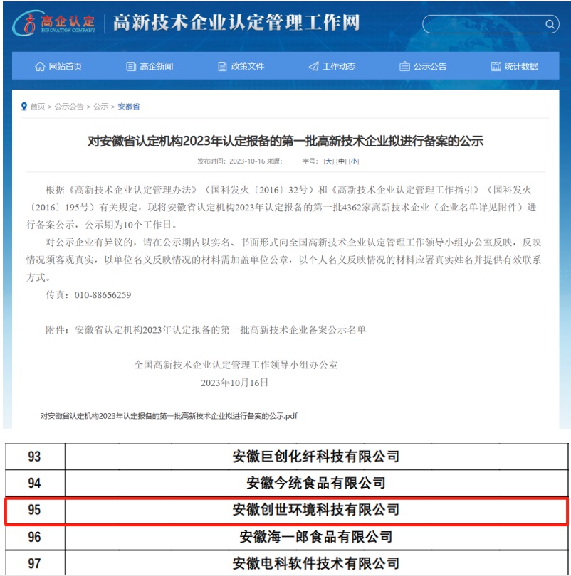 11月7日,全國高新技術企業認定管理工作領導小組辦公室發布了《對安徽省認定機構2023年認定報備的第一批高新技術企業進行備案的公告》。安徽創世環境科技有限公司榮列其中,順利通過國家“高新技術企業”認定。這一重大突破標志著創世環境在技術創新和研發方面的顯著實力得到了國家層面的高度認可。